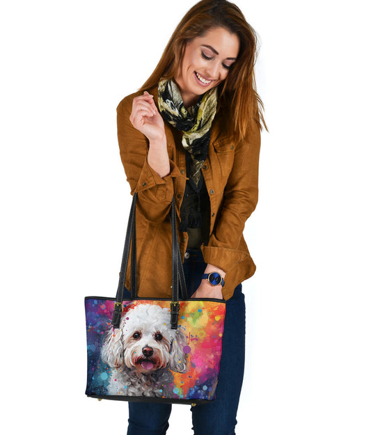 Bichon Frise Small Faux Leather Tote Featuring Art in a Neo-Pop Art Style