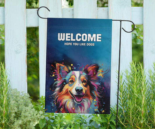 Shetland Sheepdog (Sheltie) Garden and House Flags Featuring Art in a Neo-Pop Art Style