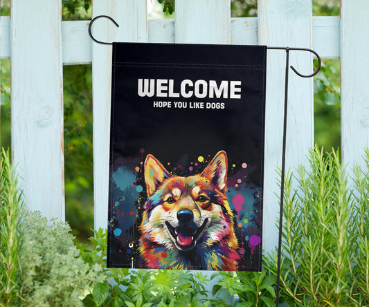 Shiba Inu Garden and House Flags Featuring Art in a Neo-Pop Art Style