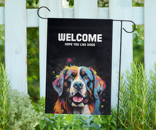 Saint Bernard Garden and House Flags Featuring Art in a Neo-Pop Art Style