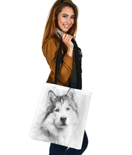 Alaskan Malamute Pencil Sketch Artwork Tote Bags